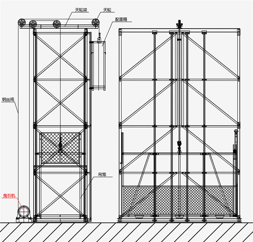 - 消除吊籠沖頂的隱患。曳引機、吊籠、配重三者相互配合,吊籠升配重降,吊籠降配重升。